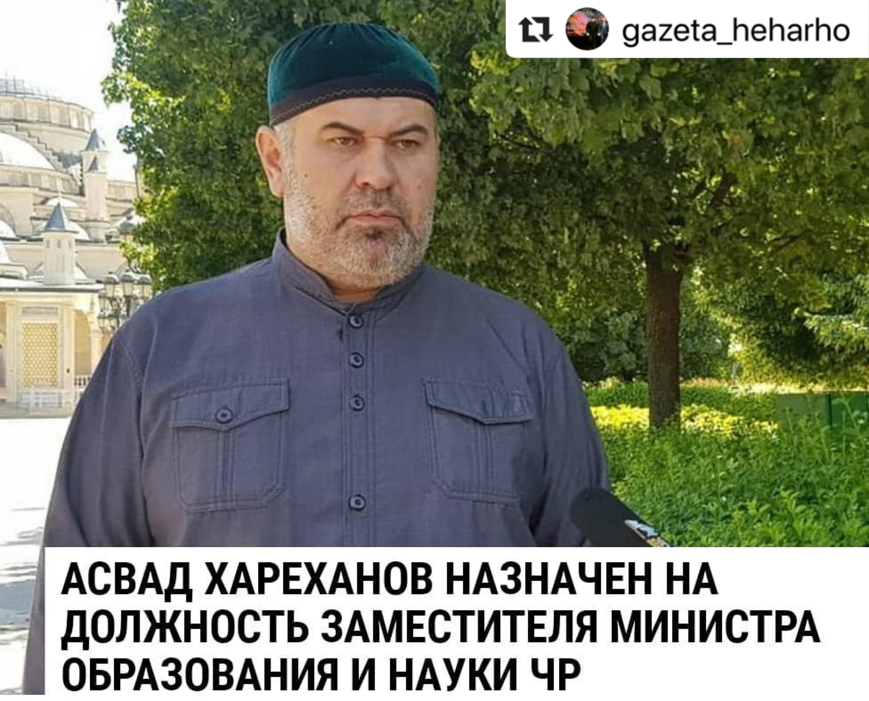 Заместитель муфтия ЧР Асвад Хареханов назначен на должность заместителя министра образования и науки ЧР.