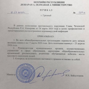 16.03.2020В соответствии с приказом МО и Н ЧР от 16.03.2020 №404-п, в целях профилактики и предотвращения распространения коронавирусной инфекции дата начала весенних каникул перенесена на 17 марта 2020 года. Дата окончания - 25 апреля.