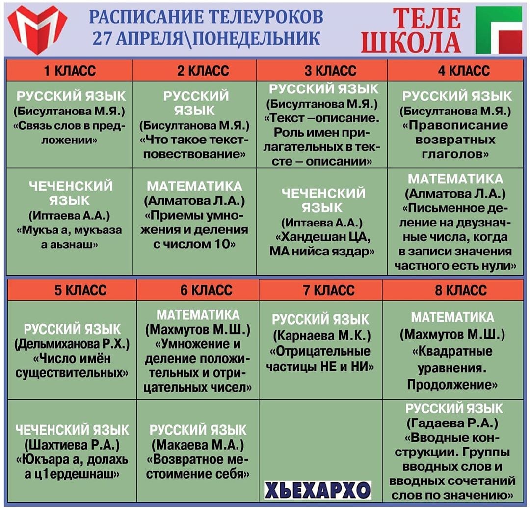 26.04.2020Напомним, что в эфире ЧГТРК «Грозный» продолжается реализация проекта Министерства образования и науки Чеченской Республики «Телешкола», в ходе которого лучшие учителя республики в процессе занятий не только объясняют наиболее сложные темы, но и помогают школьникам и их родителям сориентироваться в учебной программе.