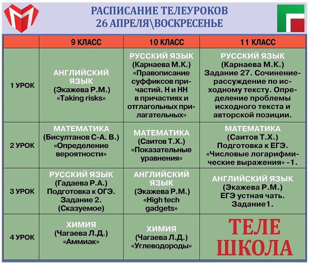 Расписание телеуроков для школьников на понедельник 26 апреля.