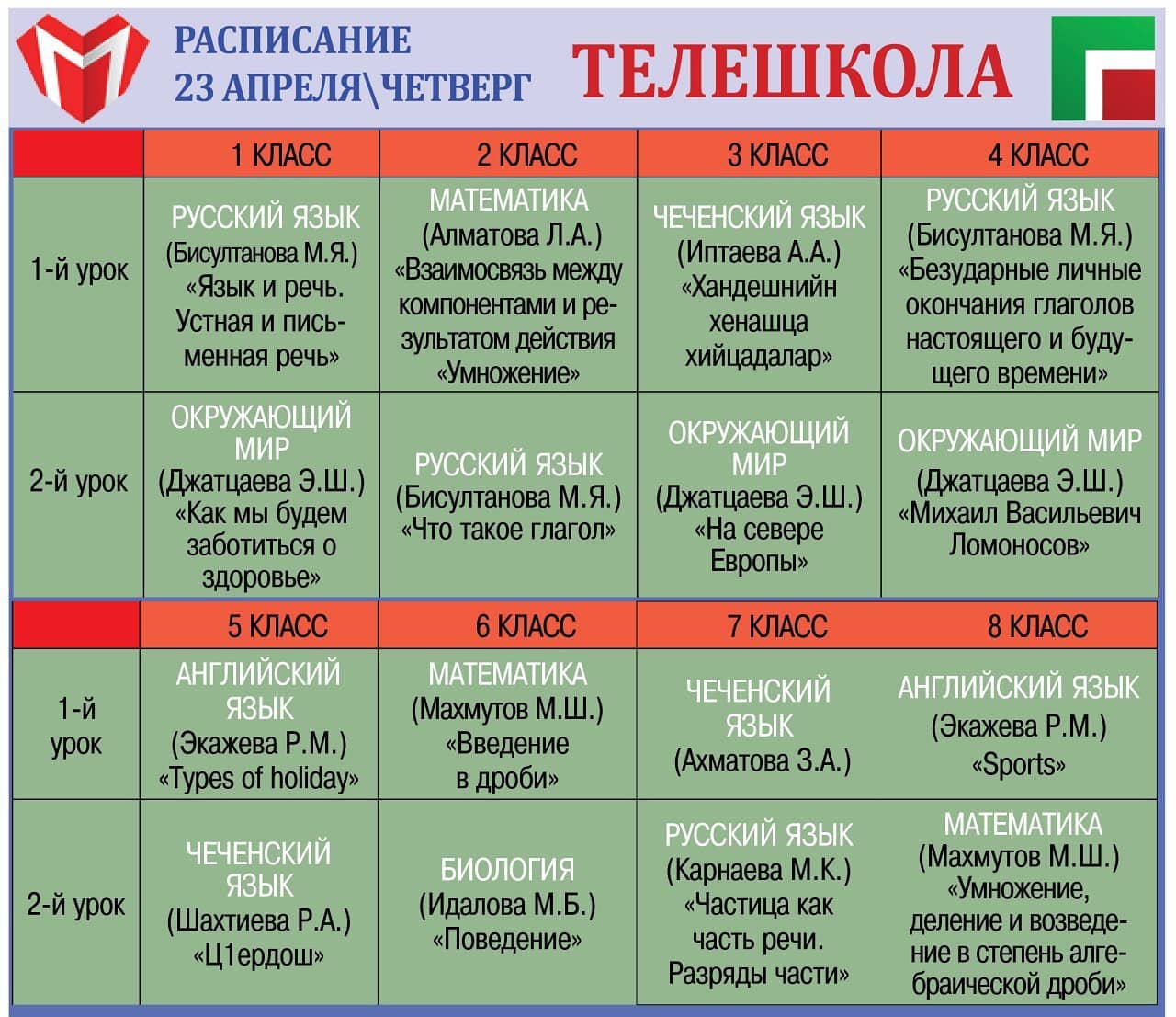 Учащиеся! Публикуем расписание на 23.04.2020 г. трансляции нового телевизионного образовательного проекта на ЧГТРК «ГРОЗНЫЙ» "ТЕЛЕШКОЛА"