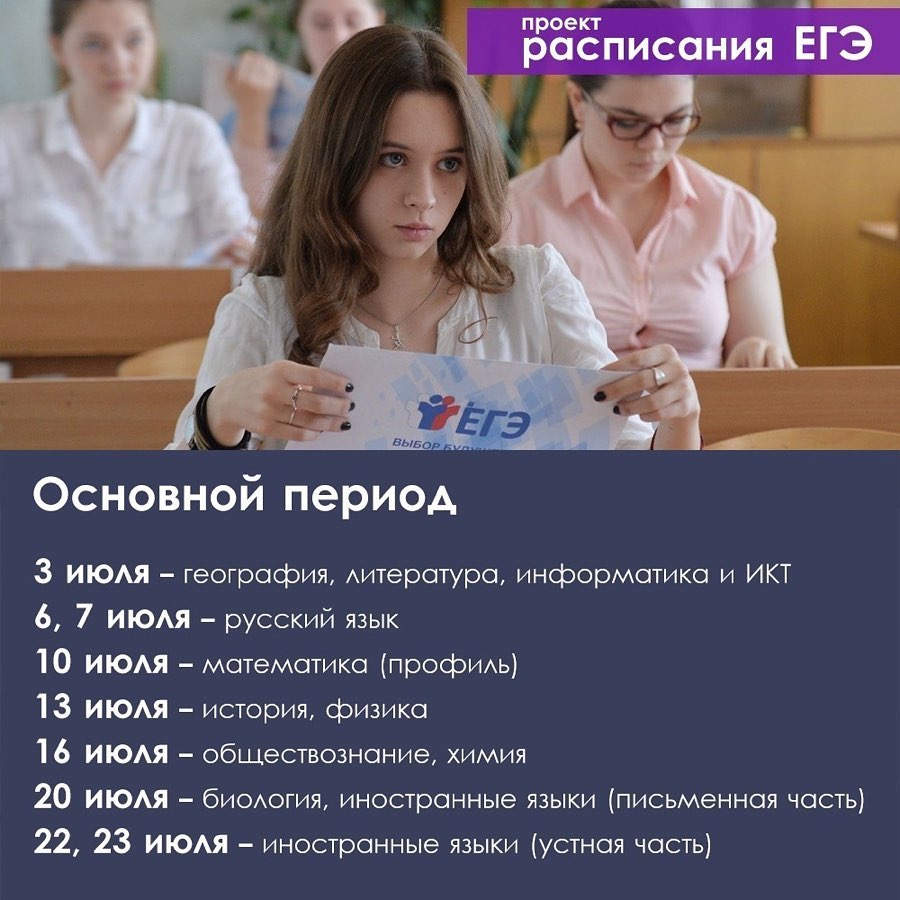 29.05.2020Расписание ЕГЭ в 2020 году — даты экзаменов 29 и 30 июня пройдет пробный ЕГЭ без участия детей! Экзамены начнутся с 3 июля. Основной период сдачи ЕГЭ 2020 3 июля (пятница) География, Литература, Информатика и ИКТ 6 и 7 июля Русский язык 10 июля (пятница) Математика (профильный уровень) 13 июля (понедельник) История, Физика 16 июля (четверг) Обществознание, Химия 20 июля (понедельник) Иностранные языки (письменно), Биология 22 июля (среда) Иностранные языки (устно) 23 июля (четверг) Иностранные языки (устно) Резервные дни 24 июля (четверг) — все предметы (кроме русского и иностранных языков) 25 июля (пятница) — все предметы Вторая волна ЕГЭ 3 августа — география, литература, информатика, биология, история и устная часть экзамена по иностранным языкам 5 августа — русский язык 7 августа — обществознание, химия, физика, профильная математика и письменная часть по иностранным языкам 8 августа — резервный день для сдачи экзаменов по всем предметам