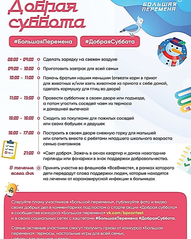 22.01.202122 января 2021 года в сообществе Всероссийского конкурса для школьников «Большая перемена» социальной сети ВКонтакте (https://vk.com/bpcontest) стартует Всероссийская акция «Добрая суббота». Инициаторами акции выступили участники «Большой перемены», они предложили всем школьникам и их родителям начать новый год с добрых дел и полезных привычек. Акция «Добрая суббота» пройдет впервые 23 января 2021 года и предоставит возможности для самореализации ребят в среде волонтерства и социального проектирования. Акция станет традиционной и будет проводиться еженедельно в сообществе конкурса «Большая перемена». Цель акции – познакомить школьников с волонтерской деятельностью, вовлечь в добровольческое движение в своем регионе. Волонтёрские образовательные проекты – важное дополнение к воспитательному процессу, который с сентября начал реализацию в рамках типовой программы воспитания в школах.