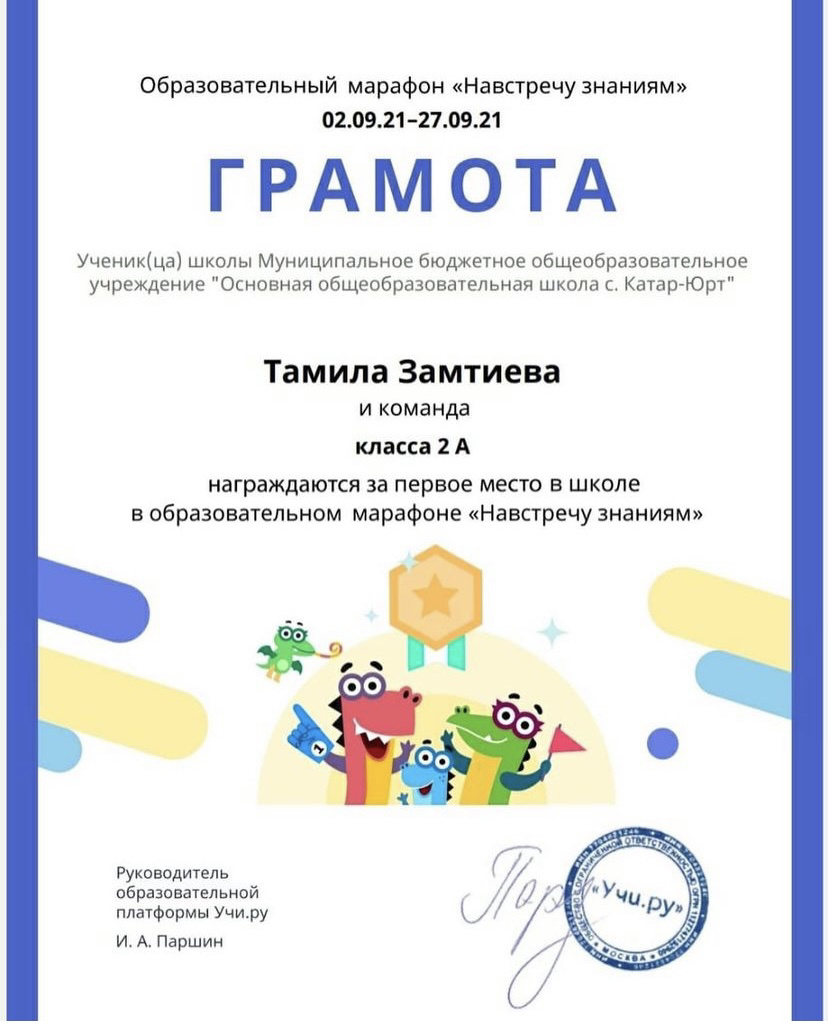 Учи.ру — российская онлайн-платформа, где учащиеся из всех регионов России изучают школьные предметы в интерактивной форме.Наши учащиеся с большим интересом занимаются на @uchi_ru .Наша звёздочка Замтиева Тамила ,ученица 2-го класса заняла первое место.