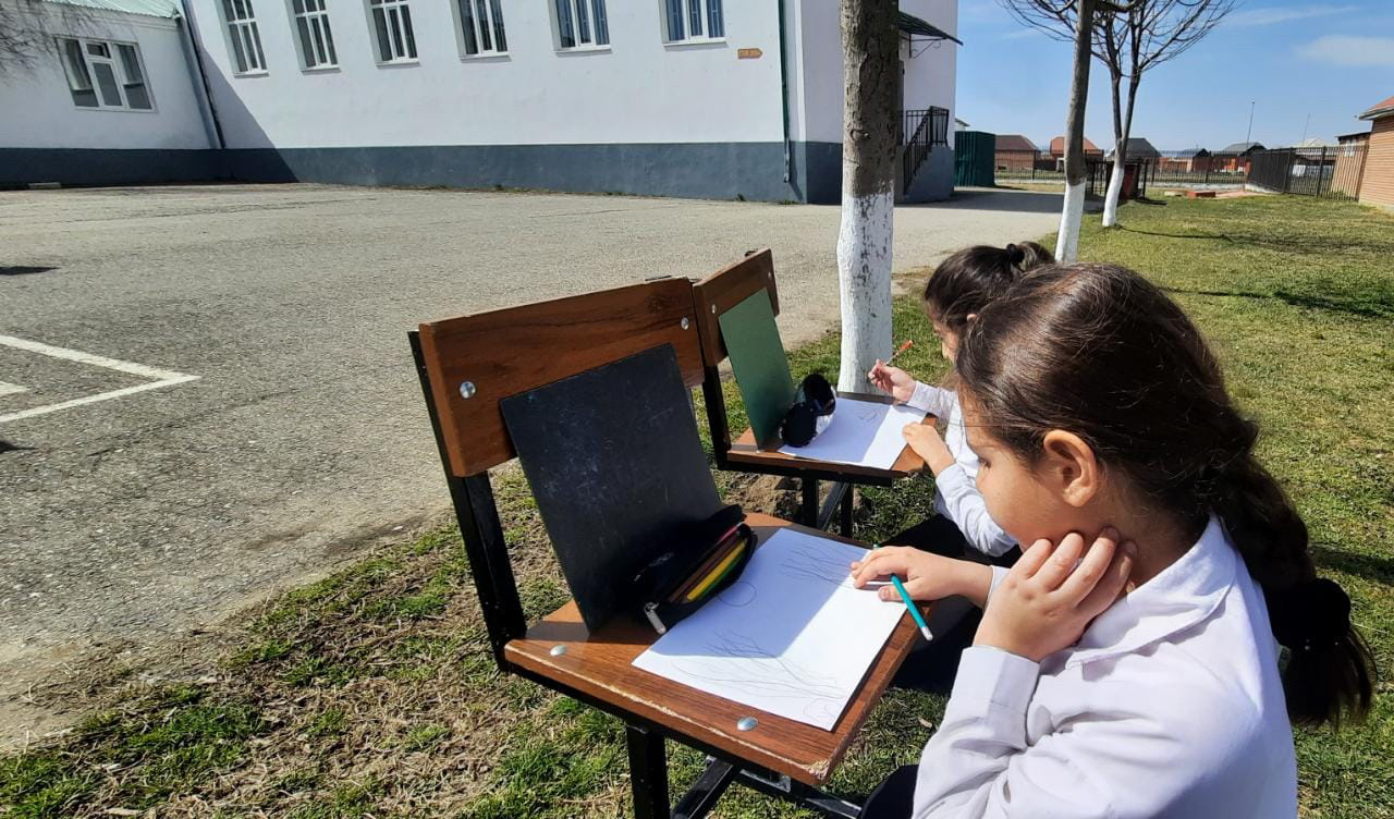 В солнечный ясный денёк... школьники взяли с собой стулья, бумагу и ...
