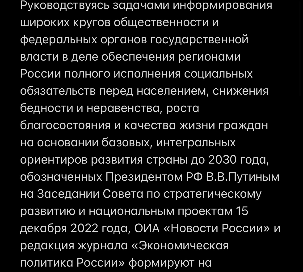 Руководствуясь задачами информирования широких кругов общественности и федеральных органов государственной власти в деле обеспечения регионами России полного исполнения социальных обязательств перед населением, снижения бедности и неравенства, роста благосостояния и качества жизни граждан на основании базовых, интегральных ориентиров развития страны до 2030 года, обозначенных Президентом РФ В.В.Путиным на Заседании Совета по стратегическому развитию и национальным проектам 15 декабря 2022 года, ОИА «Новости России» и редакция журнала «Экономическая политика России» формируют на портале https://rusregioninform.ru/ Федеральный путеводитель жителей субъектов РФ «Регионы России — людям» https://rusregioninform.ru/novosti-regionov/regiony-rossii-lyudyam-federalnyj-putevoditel-zhitelej-subektov-rf.html