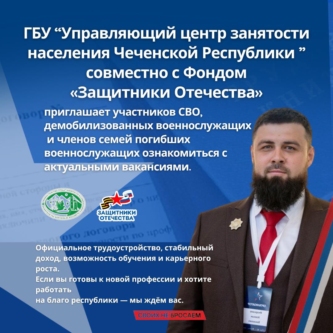 Филиал Государственного Фонда поддержки участников специальной военной операции «Защитники Отечества» в Чеченской Республике совместно с Государственным бюджетным учреждением «Управляющий Центр занятости населения» Министерства труда, занятости и социального развития ЧР объявляет о проведении мероприятия по содействию трудоустройству ветеранов СВО, демобилизованных военнослужащих и членов семей погибших защитников Отечества.