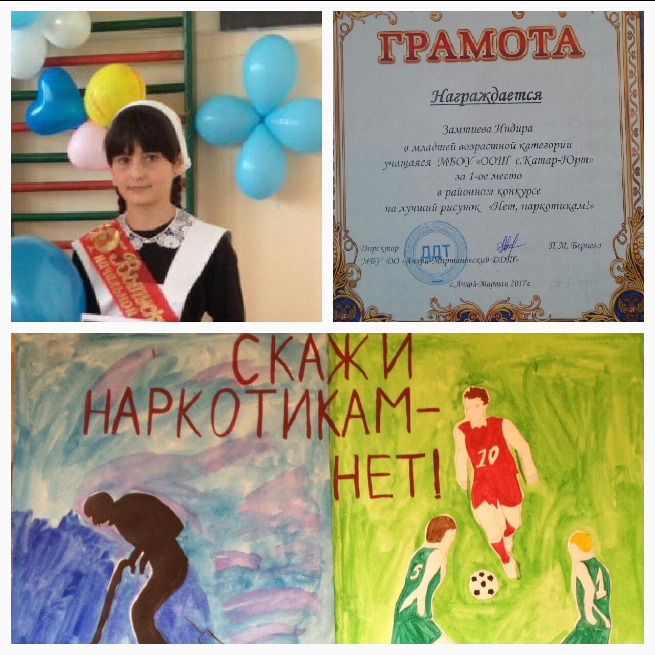 Замтиева Индира, ученица 5 "А" класса МБОУ "ООШ с. Катар-Юрт" приняла участие в районном конкурсе рисунков "Нет, наркотикам!" и заняла I-е место!
