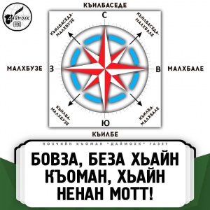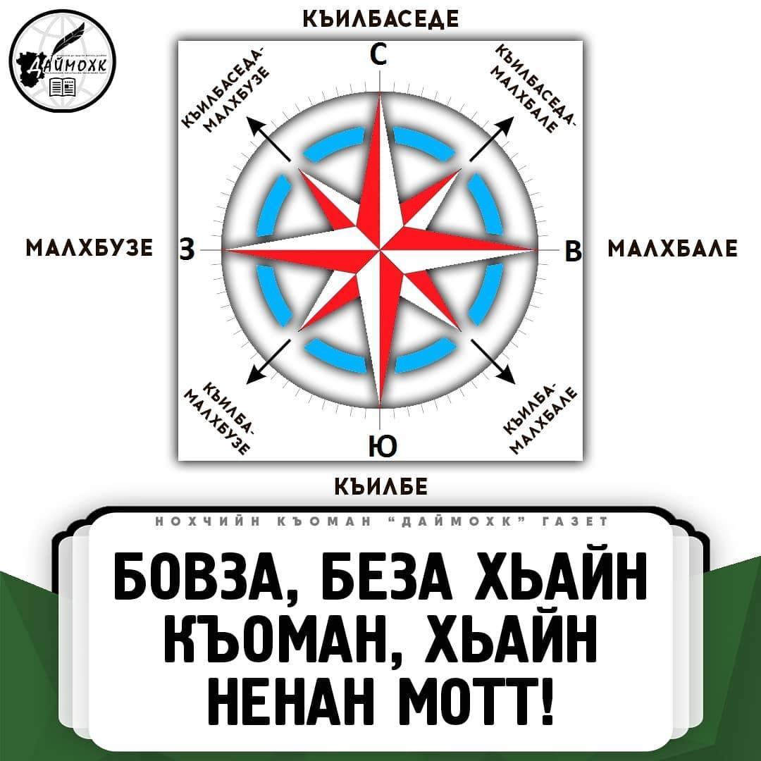 25.12.2018ТИДАМЕ ЭЦА:• Къилбаседе - север;• Къилбе - юг;• Малхбале - восток;• Малхбузе - запад;• Къилбаседа-малхбале - северо-восток;• Къилбаседа-малхбузе - северо-запад;• Къилба-малхбале - юго-восток;• Къилба-малхбузе - юго-запад.