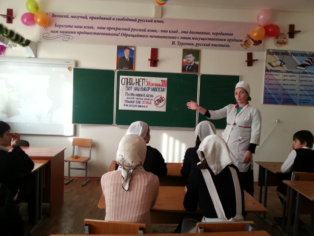 13.12.2014С целью углубления знаний учащихся о возникновении и природе вируса ВИЧ, пропаганде знаний среди подростков о возможных путях заражения ВИЧ и профилактике СПИДа в МБОУ «ООШ с. Катар-Юрт» 13.12.2014 г. в старших классах было подготовлено и организовано педагогом-психологом Бекхановой Л. Ш. мероприятие «Здоровый Я – здоровая Россия» с приглашением медработника Давлетмирзаевой М. М.