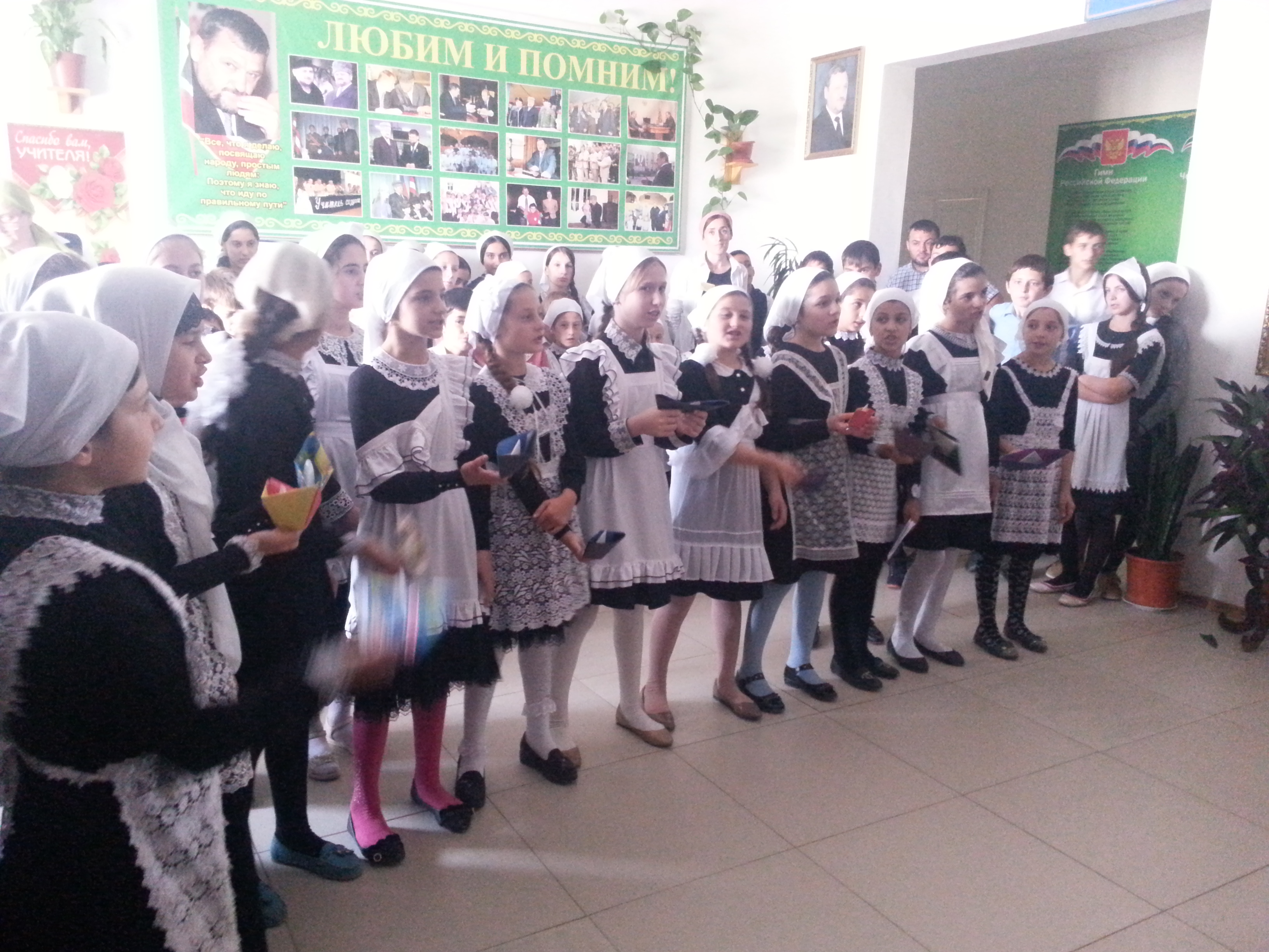 В нашей школе всвязи с праздниками были проведены следующие мероприятия:с 1 по 3 октября 2015 г. классные часы: «Помни прошлое – выбирай будущее» (7-9 кл.), «Выбираем: труд или лень» (3-6 кл.), «Учитель создает нацию» (1-9 кл.) круглые столы «В жизни человека есть всегда места подвигу» (5-9 кл.) конкурс сочинений на тему «Мой дом - моя крепость»1 место – Арснукаева Хеда (8 кл.)5 октября 2015 г. была проведена торжественная линейка, приуроченная Дню учителя. День учителя — один из самых любимых профессиональных праздников. В этот день учителя принимают поздравления от своих воспитанников, которые дарят им цветы и подарки, устраивают концерты, рисуют красочные стенгазеты и по традиции во многих школах проводят День самоуправления. Учитель — это не только человек, обучающий наукам, но еще и носитель духовности и нравственного начала.