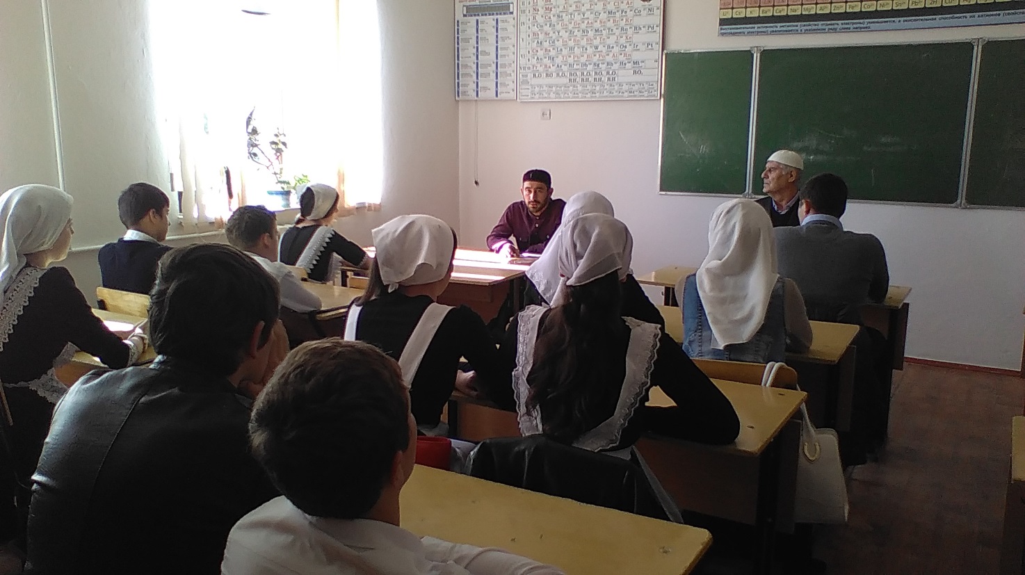 19 октября 2015 г. состоялась встреча учащихся школы с помощником имама села Икаевым Р. Ч. Он выступил перед учащимися на тему: «Совершение хаджа – один из обязательных столпов Ислама». Рузбек-хаджи рассказал учащимся о том, как по воле и милости Аллаха ему удалось совершить хадж в Мекку, о миллионах людей со всего света, которые приехали в Аравию для совершения хаджа.Впечатления такие, что нашему разуму просто непосильно осознать это и передать другому. Остается только огромное желание, чтобы вновь посетить эти священные места.Он рассказал об условиях, которые налагаются на человека, если они хотят, чтобы хадж считался состоявшимся, о чем все паломники просили у Аллаха.