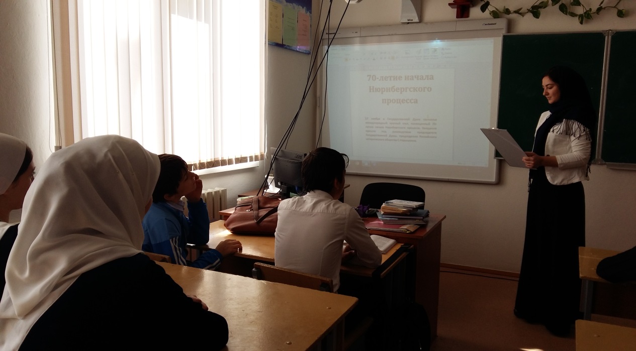 На основании письма Минобрнауки России № НТ-427/08 от 21.04.2015 г., в соответствии с поручением Министерства образования и науки Российской Федерации Д. В. Ливанова и с целью патриотического воспитания обучающихся в МБОУ «ООШ с. Катар-Юрт» 19 ноября 2015 г. учителем истории Базуркаевой А. А. проведено мероприятие с презентацией «Право вершить судьбы», посвящённое 70-летию начала Нюрнбергского процесса. Приняли участие обучающиеся 8 и 9 классов.Базуркаева А. А. начала свое выступление со словами «Наше мероприятие посвящено 70-летию Нюрнбергского процесса - Международного суда над лидерами нацизма. Масштабы нацистских злодеяний против человечества огромны. История мировой цивилизации не знает такого массового, зверского истребления мирного населения, какое совершили гитлеровцы на оккупированных территориях.»Затем, она зачитала учащимся всеобщую декларацию прав человека.Ребятам была продемонстрирована презентация «Право вершить судьбы».Далее был просмотр фильма и обсуждение (задавались вопросы учащимся по фильму) просмотренного материала. Завершилось мероприятие со следующими словами: «Победа в войне способствовала признанию значимости таких ценностей, как гуманизм, свобода и равноправие народов. Основным источником победы советского народа в войне был его патриотизм, понимание угрозы уничтожения человечества. Победа далась большой ценой: разрушение и уничтожение советских городов, сёл и деревень. Потери Красной Армии за годы войны составили около 12 млн. человек. От бомбёжек, репрессий, голода и болезней на оккупированных территориях погибло 13 млн. человек. Почти каждая семья потеряла отца, сына, брата... И, тем не менее долгожданный День Победы стал в народном сознании радостным праздником, означавшим конец страшной, кровопролитной войны.»