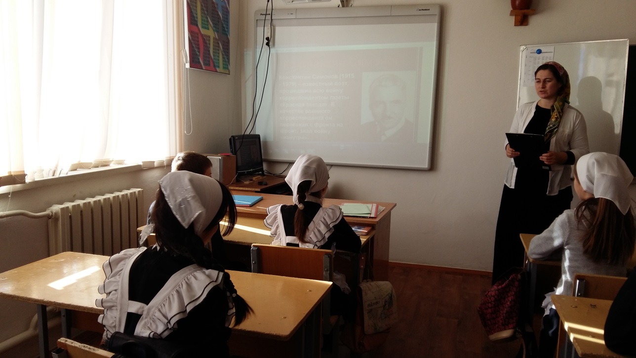 19-20 ноября 2015 г. в МБОУ «ООШ с. Катар-Юрт» были проведены тематические уроки, посвященные 100-летию со дня рождения К. М. Симонова на следующие темы: «К. М. Симонов знакомство с биографией поэта –фронтовика.», «Стихия. Антология русской поэзии», «Память длиннее времени».На уроках, посвященном 100-летию со дня рождения К.М. Симонова, учащиеся должны понять, что такое внимание к личности и творчеству поэта неслучайно. Советский поэт и общественный деятель Константин Симонов родился в Петрограде, участвовал в Великой Отечественной войне. В годы войны Симонов сотрудничал с газетой «Боевое знамя». После окончания войны побывал в Японии, США и Китае. Он работал главным редактором журнала «Новый мир», затем — «Литературной газеты», сотрудничал с газетой «Правда». Прославился как автор патриотических стихов, среди которых произведение «Жди меня». Симонов — лауреат шести Сталинских премий. Основная задача учителя – дать учащимся представление о жизненном и творческом пути поэта, познакомить с оценкой его творчества профессиональными читателями. Воспитательной целью урока является создание педагогических условий для формирования гражданских и патриотических чувств школьников через обращение к творчеству поэта-юбиляра.